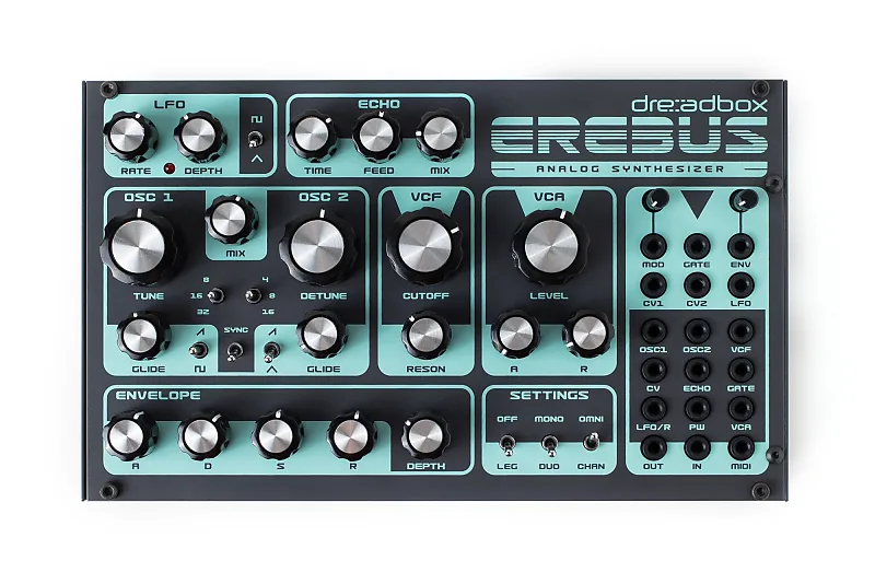 > Теплое звучание осцилляторов > Классический фильтр Dreadbox > Резкие генераторы огибающих > Эффект Lo-Fi Delay для расширения звучания > CV-выходы: огибающая, LFO, модулятор, гейт, CV1, CV2 > CV-входы: Osc1, Osc2, эхо, срез, CV, гейт, частота LFO, ширина импульса, VCA