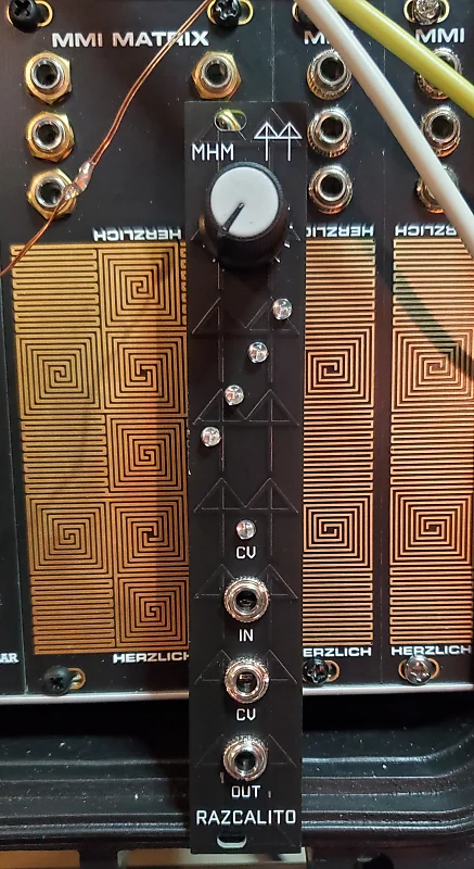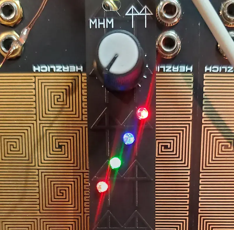 4 светодиода циклично сменяют цветовую схему, но сдвинуты друг относительно друга.Это создает «случайное» CV, которое затем можно использовать для модуляции других параметров.Это «пассивный» модуль, которому для работы требуется только входящее управляющее напряжение.Есть ручка для кроссфейда между вашим входным сигналом и степенью его влияния на этот сигнал.Также есть второй CV-вход , чтобы частично замораживать циклирование, например, когда входящий гейт-сигнал высокий.