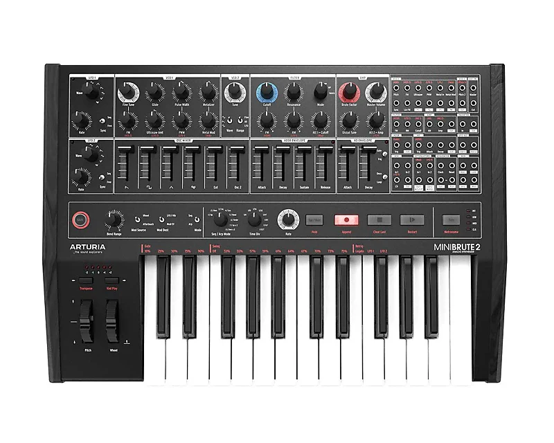 Объединяя мощный аналоговый звук, продвинутые возможности формирования тембра, секвенсор шагов, арпеджиатор и модульный патч-бей, MiniBrute 2 оснащен смешиваемыми многоволновыми VCO1 и VCO2 с шейперами звука: пилоподобная, Ultrasaw, квадратная, импульсная, треугольная, Metalizer и синусоидальная волны, с режимами тонкой и грубой настройки, генератором шума и внешним входом; мультирежимный фильтр Steiner-Parker с насыщенным кислотным тоном, способный к автоколебанию.