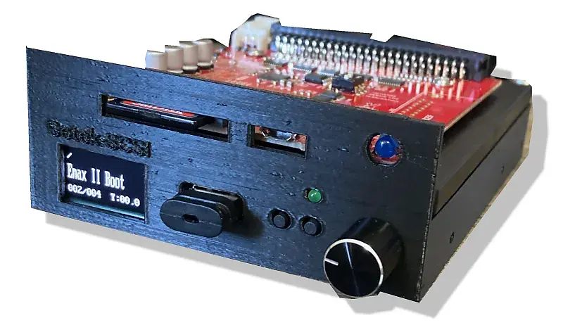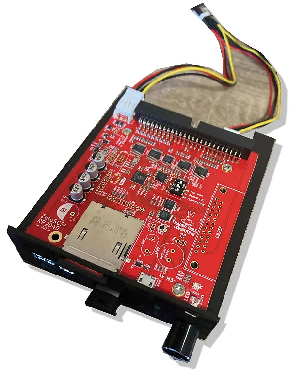 Это плата ZuluSCSI, установленная на верхнюю часть эмулятора дисковода Gotek. Она предназначена только для семплеров, использующих SCSI и имеющих высокий бeзель: Ensoniq EPS, EPS 16-PLUS, и Emu Emax I, Emax II.Для получения дополнительной информации о ZuluSCSI смотрите спецификации в Internal ZuluSCSI SKU.