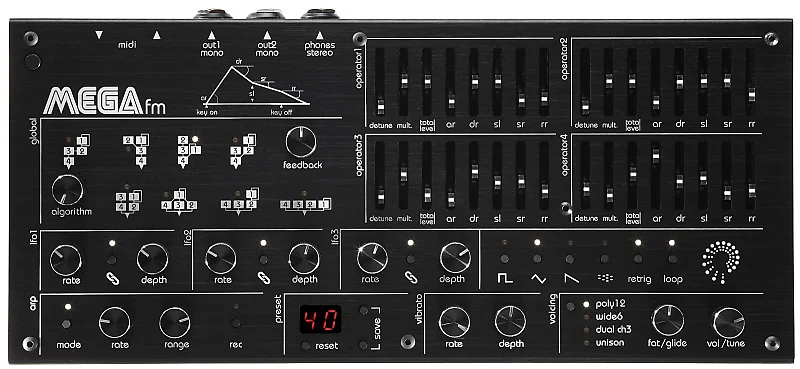 MegaFM оснащен 2 чипами, всего 12 голосов, распределенных по двум выходам