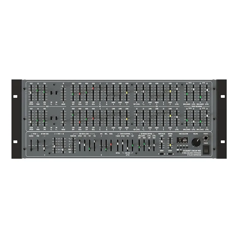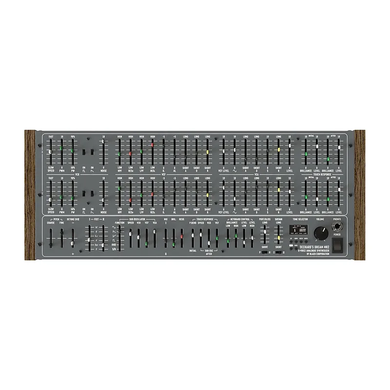 DECKARD’S DREAM, или DDRM, оснащен восемью голосами, каждый из которых имеет две идентичные наложенные части, состоящие из 100% аналогового генератора напряжения , созданного с помощью дискретных волновых формирователей, аналогового фильтра низких и высоких частот , генератора шума, уникальной многосегментной огибающей фильтра и усилителя VCA с огибающей ADSR.Каждая часть также имеет собственный независимый программируемый раздел для управления срезом фильтра и усилителем с помощью скорости нажатия клавиш и полифонического посленажатия на основе MPE.