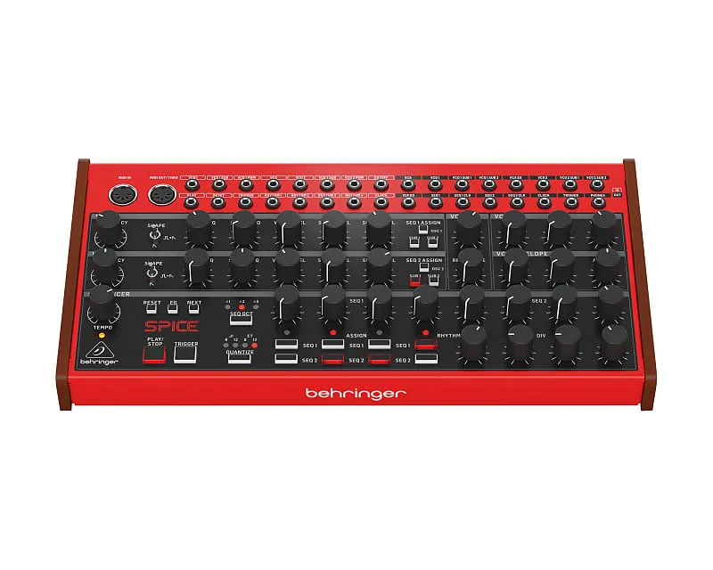 Behringer Spice - это полу-модульный полиритмический аналоговый синтезатор, оснащенный двумя аналоговыми осцилляторами, каждый из которых имеет пилообразные и квадратные формы волн, а также двумя настраиваемыми суб-осцилляторами; фильтром низких частот с резонансом, генераторами огибающей VCA и VCF, каждый с регулируемым временем атаки и затухания, двумя 4-ступенчатыми секвенсорами с выборочной квантованием, четырьмя регулируемыми делителями тактов для создания полиритмических паттернов, патчбэем с 16 входами и выходами для расширенных возможностей формирования звука и совместимостью с другими модульными синтезаторами и секвенсорами.