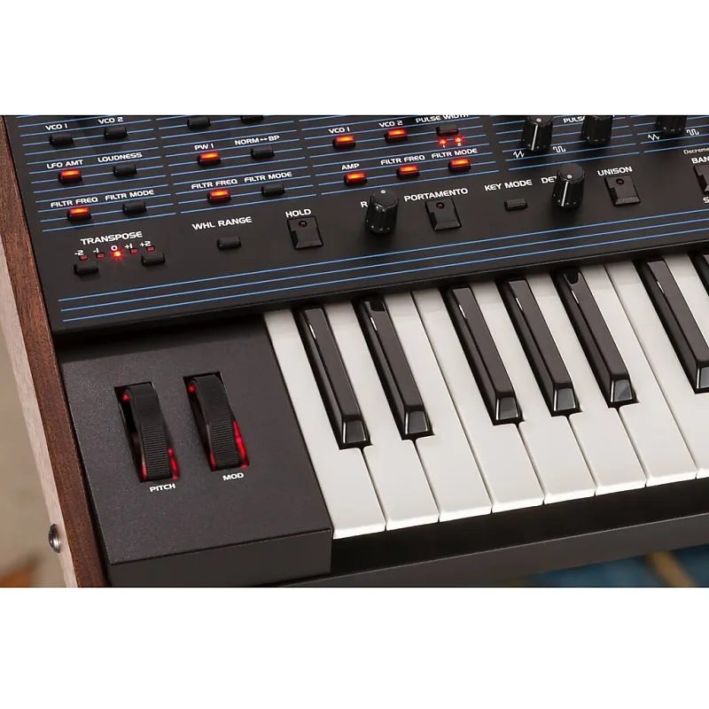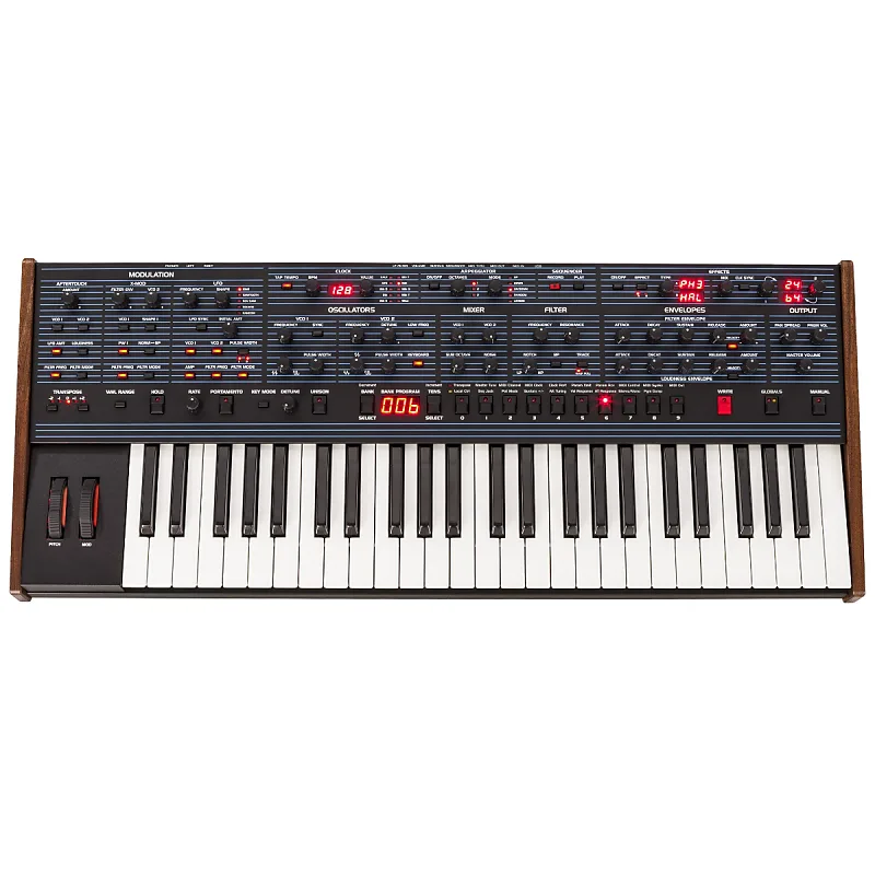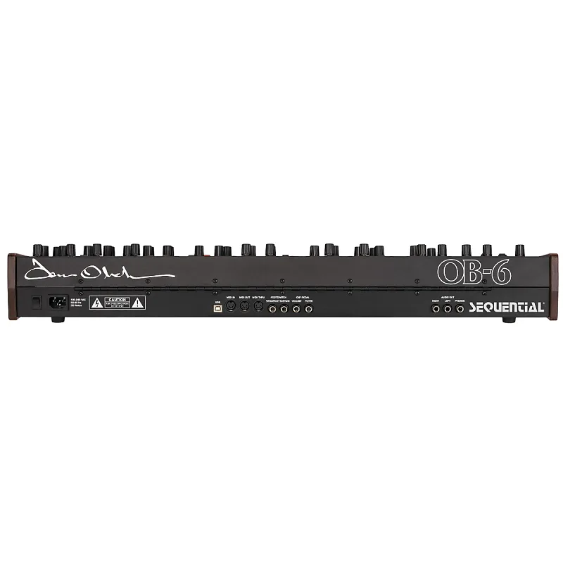 X-Mod и полифоническая пошаговая секвенцияТакже присутствует X-Mod, который расширяет тональную палитру и упрощает создавать драматические и нестандартные звуки.Источниками модуляции являются огибающая фильтра и осциллятор 2, оба с биполярным управлением.Назначения включают частоту осциллятора 1, форму осциллятора 1, ширину импульса осциллятора 1, срез фильтра и режим фильтра.Полифонический секвенсор шагов позволяет создавать до 64 шагов и до 6 нот на шаг.Вы можете создавать последовательности полифонически, с паузами, и синхронизировать их с внешними MIDI часами.Полнофункциональный арпеджиатор также может синхронизироваться с внешними MIDI часами.Режим унисона включает настраиваемое количество голосов , память аккордов и режимы клавиш.Легко программироватьРучки на передней панели предоставляют доступ практически ко всем функциям OB-6.В комплект входит 500 постоянных заводских программ и 500 перезаписываемых пользовательских программ.Включение кнопки Manual активирует режим «живой панели», в котором звук OB-6 соответствует текущим настройкам передней панели.В этом состоянии вы слышите именно то, что видите.Легко игратьЭтот аналоговый мощная установка заключена в клавиатуру с четырьмя октавами и полу-взвешенными клавишами с чувствительностью к нажатию и послевибрационной отдачей по каналу, что делает ее идеальной для сцены или студии.