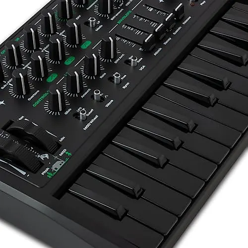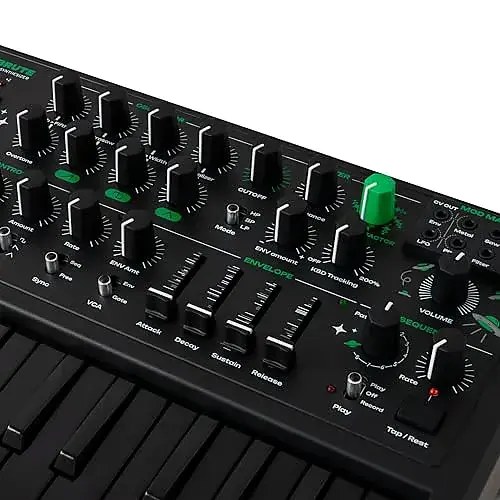 Синтезатор также оснащен низкочастотным осциллятором с переключаемыми квадратными, пилообразными и синусоидальными волнами и регулируемой скоростью.По умолчанию его назначение - модулировать высоту тона осциллятора, и имеется регулировка глубины для настройки интенсивности модуляции.Он обладает внутренней памятью.который способен хранить до 8 различных паттернов, и последовательности можно сохранить на вашем компьютере с помощью прилагаемого редакторского программного обеспечения.