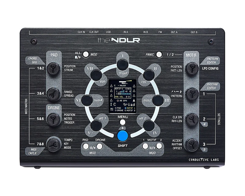 Conductive Labs NDLR - это четырехдорожечный MIDI-секвенсор, арпеджиатор, проигрыватель аккордов и дронов с четырьмя частями, которые могут управлять до 8 синтезаторами.