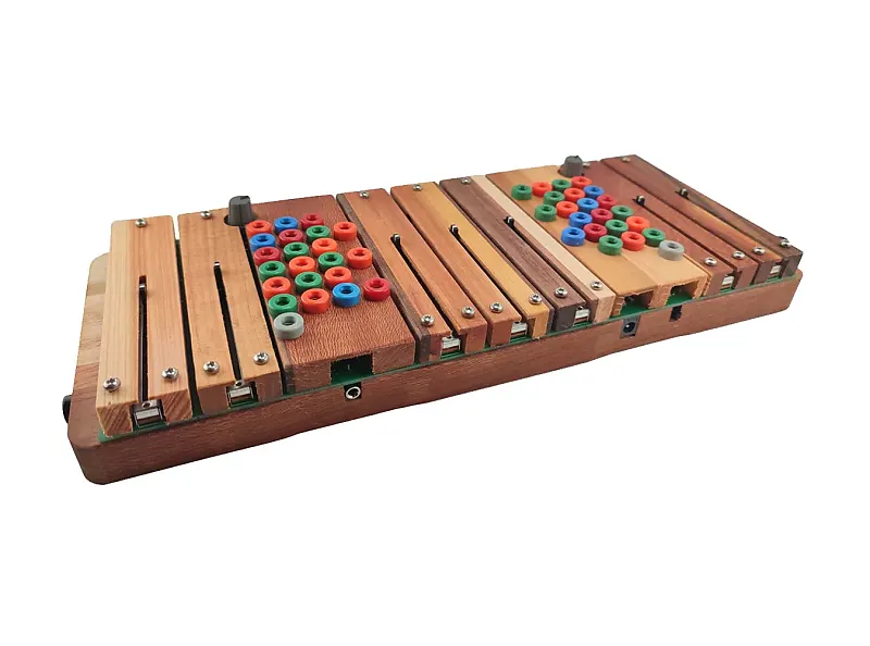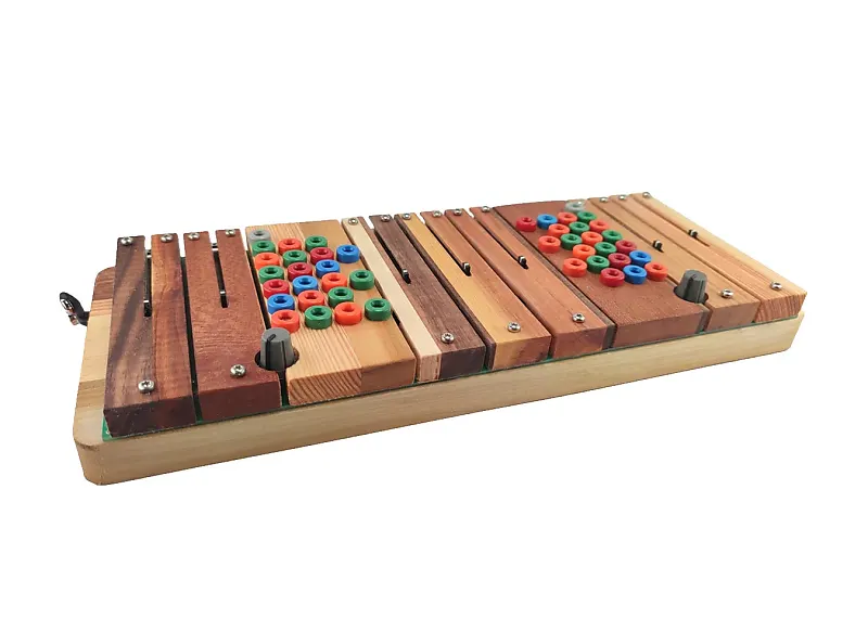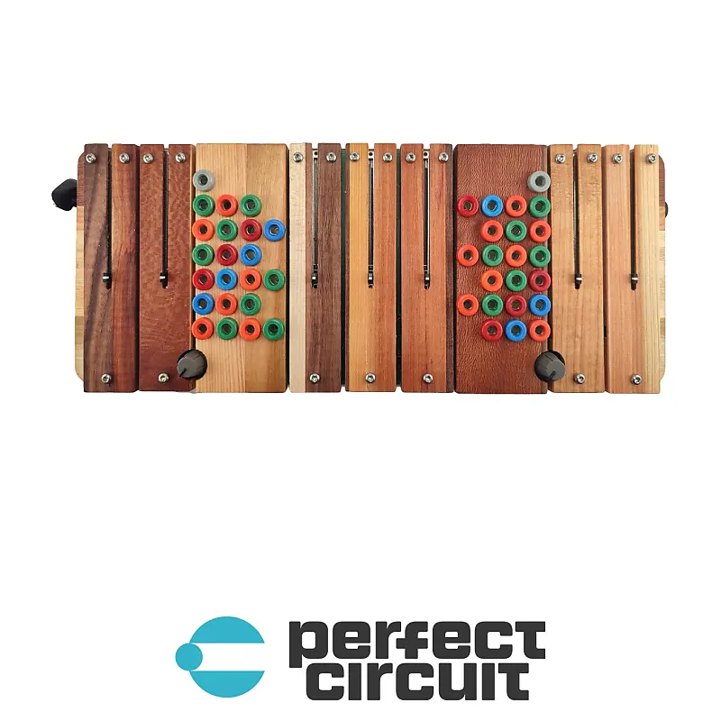 Имеется 44 точки модуляции, выполненные в виде банановых разъемов.Они расположены в семь колонок, соответствующих семи планкам.Их расположение смещено по диагонали, чтобы обеспечить близость входов к выходам.Это сделано для удобства игры прикосновением; вы можете создавать металлический звук при помощи банановых разъемов.штифты, которые можно сжать рукой, чтобы сделать жестовое исправление инструмента.Входы - это холодные цвета: синий, зеленый и серый.Выходы - горячие цвета: красный и оранжевый.Серые разъемы - это параллельные входы с основными ручками: левый для основной настройки тона, правый - для основной хаотичности.Распределение цветов для каждой полосы следующее: