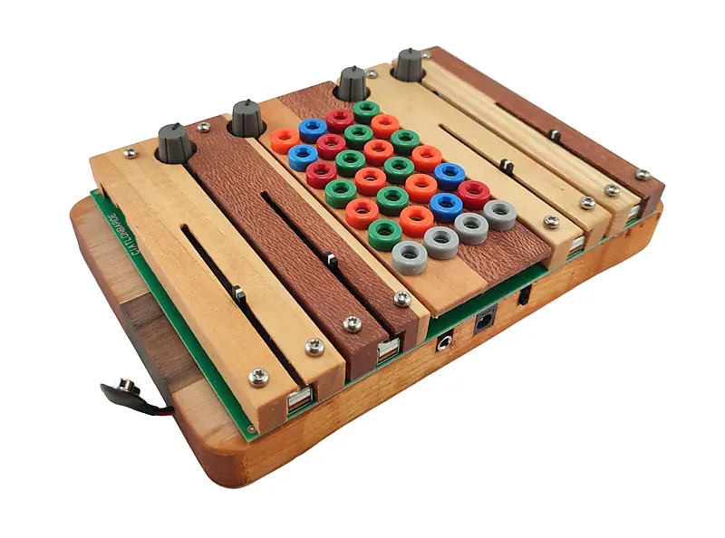Есть 28 точек модуляции, выведенных в виде банановых разъемов.Они такие расположены в четыре колонки, представляющие четыре такта.Их расположение смещено по диагонали, чтобы обеспечить возможность ввода рядом с выходами.Это сделано для удобства игры сенсорным способом; вы можете сделать металлические штекеры Banana Jack, которые можно сжимать вручную, чтобы патчить инструмент жестами.Входы имеют холодные цвета: синий, зеленый и серый.Выходы имеют теплые цвета: красный и оранжевый.Серые разъемы - это параллельные входы с главными ручками: два слева предназначены для основной высоты тона, два справа - для главного хаоса.Распределение цветов для каждого такта следующее: