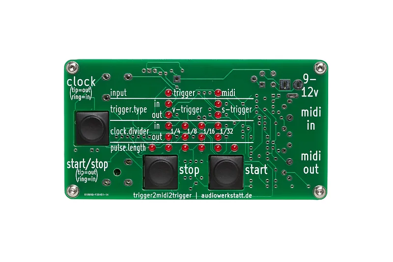 Если использовать устройство как конвертер триггерного тактового сигнала в MIDI-такт или как конвертер MIDI-такта в триггерный такт, всегда будет отправляться MIDI-тактовый сигнал на разъем "midi out".На наконечнике разъема "clock" отправляется аналоговый триггерный тактовый сигнал.Наконечник разъема "start/stop" отдает 5В, пока мастер-часовой сигнал работает, и 0В, когда мастер-часовой сигнал на паузе для v-trigger; или "closed" во время работы мастер-часа и "open" на паузе, если используется s-trigger.