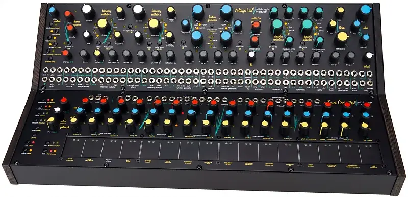 Посмотрите на этот великолепный инструмент.Pittsburgh Modular продолжает использовать цветовые кодированные ручки, которые они представили в своем предыдущем синтезаторе Taiga.