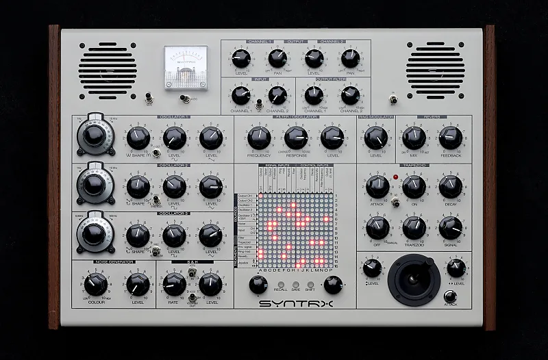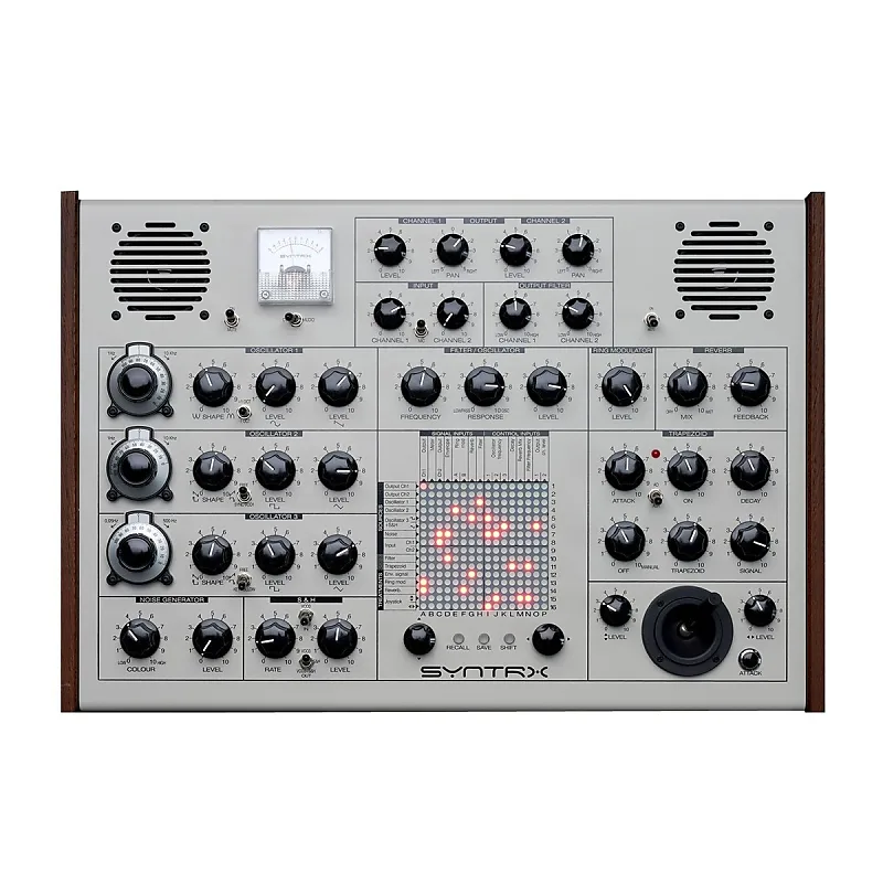 SYNTRX имеет 3 высокоточных генератора VCO с отличной настройкой на протяжении 8 октав, генератор шума с «цветным» фильтром и резонансный VCF, модулятор кольца, ревербератор с пружиной, генератор огибающей с возможностью зацикливания, джойстик-контроллер, входной усилитель с регулируемой усилительностью для сигналов от микрофона до линейного уровня, 3 VCA, фильтр выходного сигнала, аналоговый индикатор уровня CV/аудио сигнала и встроенные динамики.Дополнительные функции, отсутствующие в Synthi AKS, включают схему Sample & Hold с отдельным тактовым сигналом, переключатель октав для VCO1, синхронизацию VCO2, режим AD на генераторе огибающей, а также MIDI, который принимает сообщения CV, Gate, Modulation wheel и изменения программ для матричного управления.SYNTRX поставляется в алюминиевом корпусе с боковыми панелями из ясеня.