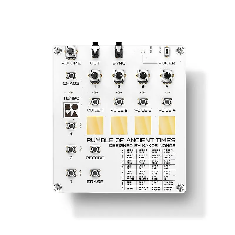 Rumble of Ancient Times был разработан и запрограммирован Какосом Ноносом, новым творческим умом, присоединившимся к команде разработчиков SOMA.Его очень уникальный стиль создания электронных музыкальных инструментов сочетает в себе качественное мастерство, продвинутое программирование и любовь к средневековым акустическим инструментам, таким как гусли, колесная лира и волынка.