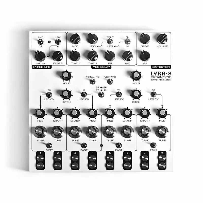 LYRA основана на восьми генераторах, которые будут называться голосами.Их конструкция не похожа на традиционный субтрактивный генератор .Вместо линейной или логарифмической зависимости от управляющего напряжения они больше напоминают генераторы тонов в старых электрических органах.Поэтому используется термин «голоса» вместо «VCO».Lyra активно использует нелинейность, а голоса сконструированы таким образом, чтобы она могла проявляться.