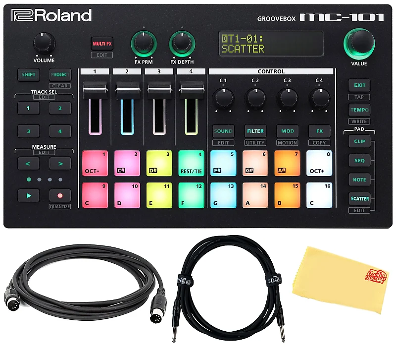 Roland MC-101 Groovebox Компактная рабочая станция для музыкального производства в комплекте с MIDI-кабелем, инструментальным кабелем и полировочной тканью Austin Bazaar