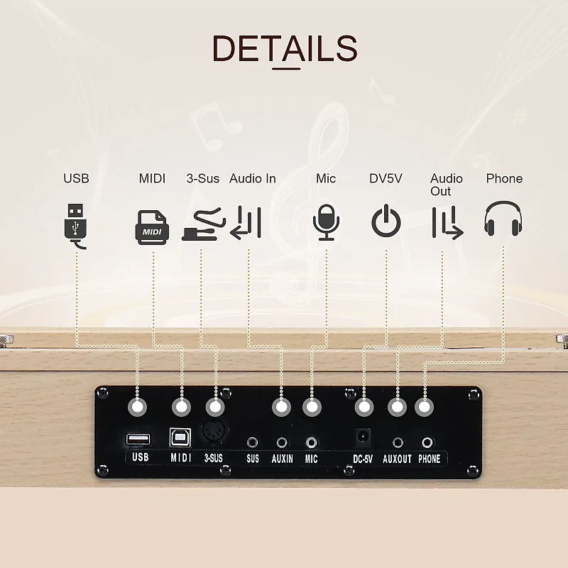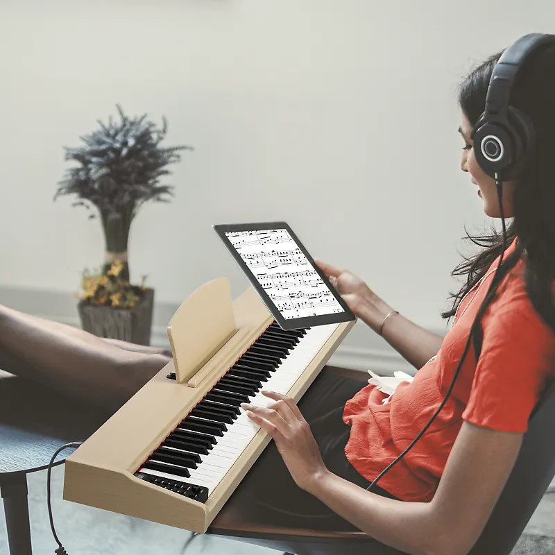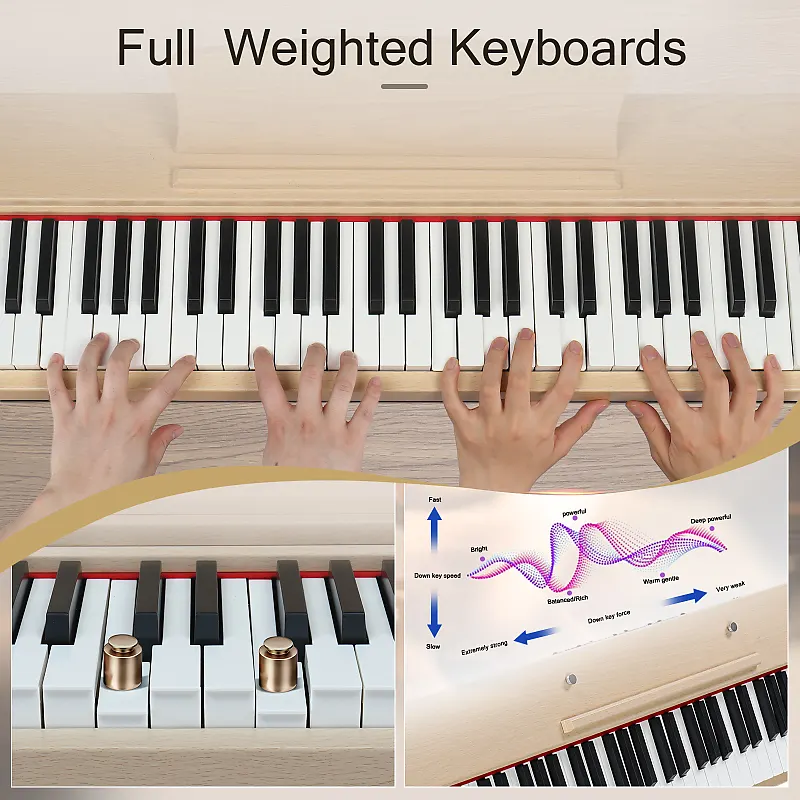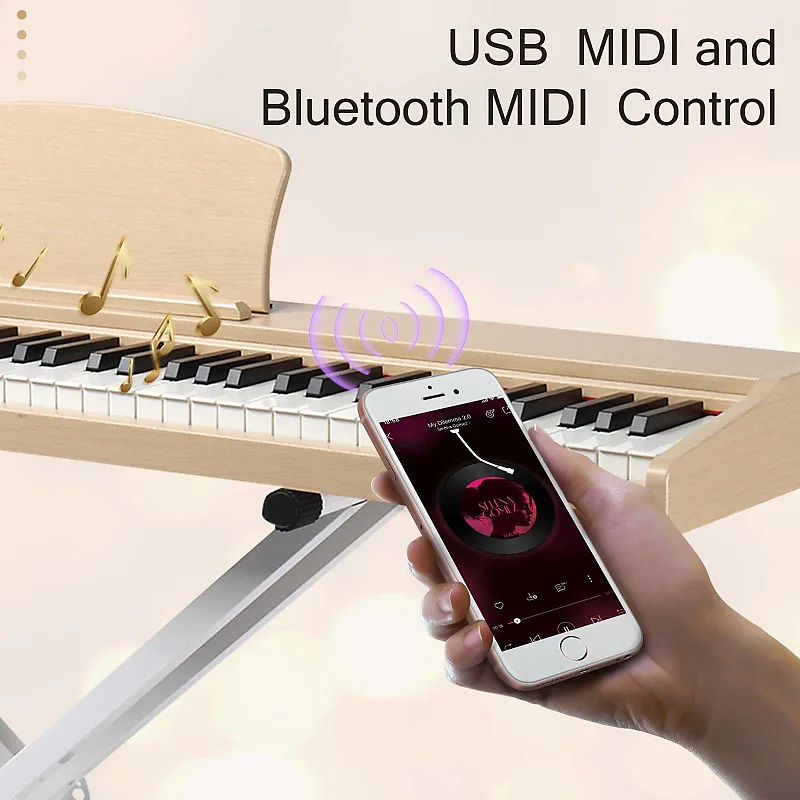 88-клавишное цифровое пианино полноразмерного типа с полувзвешенными клавишами использует высококачественный источник звука Dream Sound, который обеспечивает наиболее впечатляющие звуковые эффекты.Наше 88-клавишное пианино оснащено двумя функциями Dual Bluetooth, MP3 Bluetooth и MIDI Bluetooth.Подключите компьютер или планшет с помощью USB-кабеля для мультимедийного взаимодействия.После включения пианино Bluetooth включается автоматически.Мобильный телефон может найти MIDI Bluetooth сигнал этого пианино.После подключения программное обеспечение для игры на телефоне сможет реализовать беспроводное соединение с пианино.Оно также может быть использовано как подарок для родственников и друзей или как реквизит для театральных постановок.