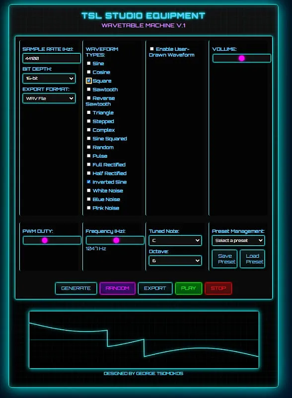 Сохраняйте и быстро загружайте любимые конфигурации.Благодаря надежному управлению пресетами вы можете сохранять пользовательские настройки - включая выбор формы волны, регулировку тона и нарисованные вручную дизайны - на локальном храните и мгновенно загружайте их, когда вас посетит вдохновение.