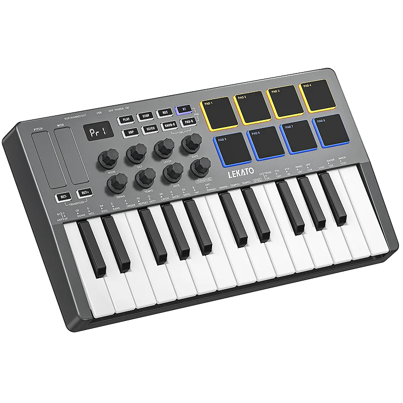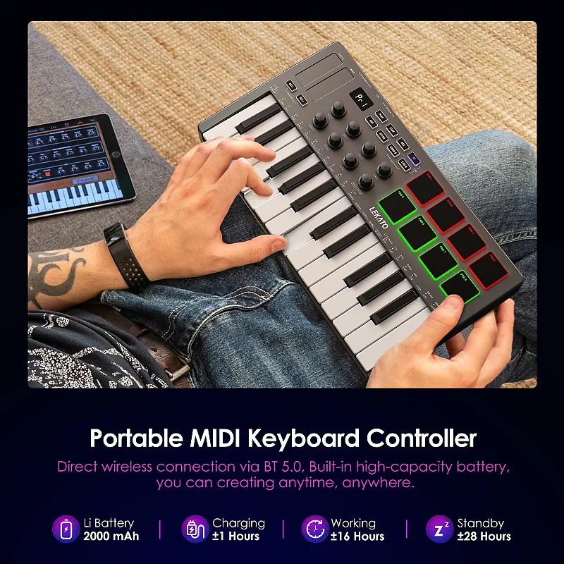 Легкий и простой в настройке для мобильности, 25-клавишная MIDI-клавиатура LEKATO работает от литиевой батареи, заряжаемой через USB.адаптер