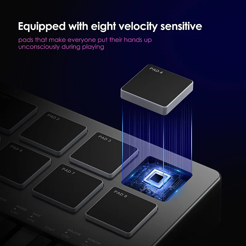 Клавиши с чувствительностью к скорости нажатия обеспечивают естественный отклик и ощущение, близкие к стандартной клавиатуре, погружая в выразительный творческий опыт - Создавайте музыку везде