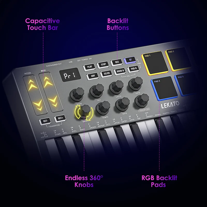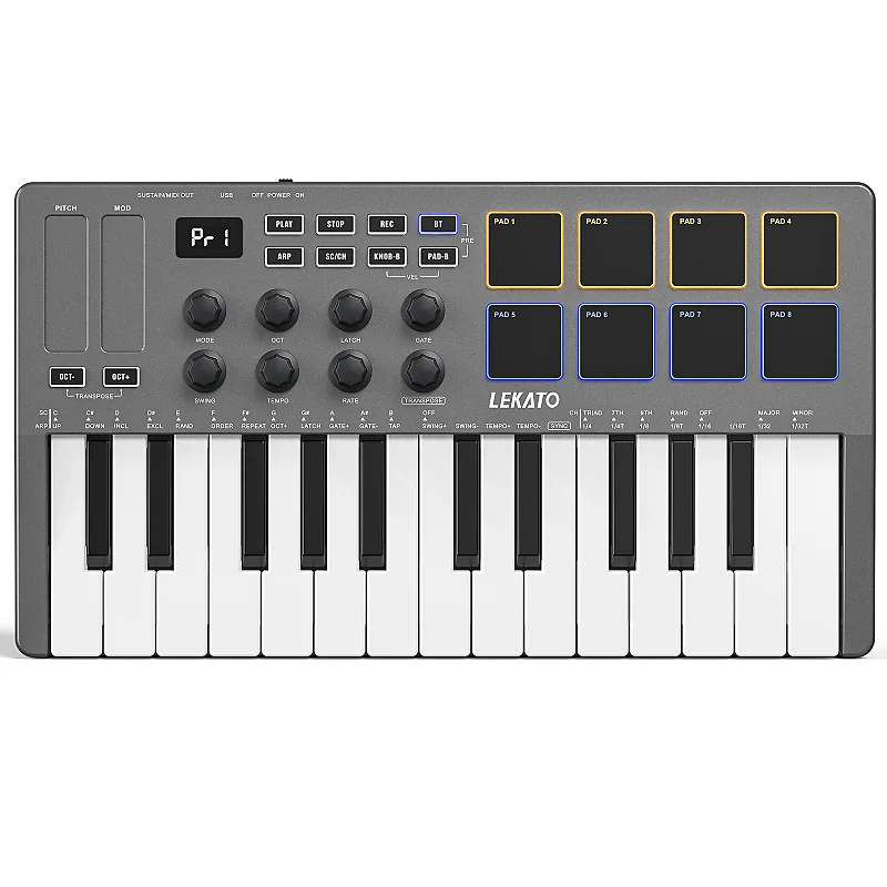 25-клавишная MIDI-клавиатура LEKATO поддерживает стандарты class-compliant, USB-MIDI и Bluetooth MIDI-соединение