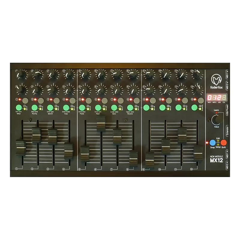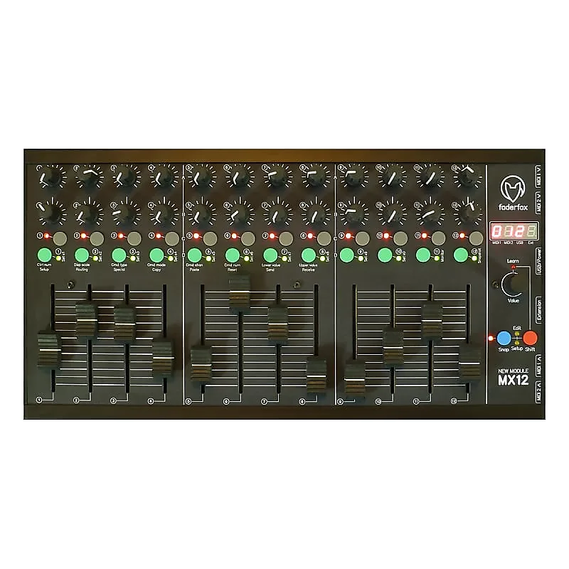 Устройство имеет 24 стандартных потенциометра, 12 фейдеров и 24 кнопки в раскладке на 12 дорожек.Возможны различные типы MIDI-команд, такие как control change, note on/off, pitchbend, aftertouch и program change.Вы можете очень быстро и просто запрограммировать любую MIDI-команду для любого отдельного элемента управления на устройстве.