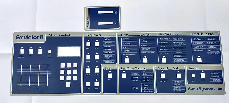 Это объявление касается полного комплекта накладок для E-mu Emulator II, включая основную панель управления и меньшую панель с колесиками Moog.