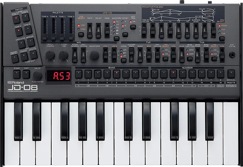 К началу 90-х годов цифровые синтезаторы с предустановками и ограниченными ручными элементами управления доминировали на рынке.JD-800 изменил все это в 1991 году, вернув мир синтезаторов к истокам с панелью, насыщенной контроллерами, и агрессивной электронно-звуковой палитрой.JD-08 включает 64 пресета с оригинального оборудования и идеально воссоздает четырехтональную структуру, 108 волновых форм и уникальные двухчастные мульти-эффекты, которые являются основой сложного, эволюционирующего звучания JD-800.