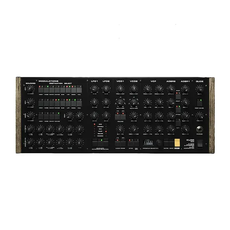 Возможности модуляции выделяют KIJIMI среди других полифонических синтезаторов.Два LFO могут быть направлены независимо до восьми целей, напрямую через кнопки на передней панели, управляя модуляцией частоты и формы волны, количеством суб-осциллятора, срезом фильтра и его частотой, а также амплитудной модуляцией.Каждый LFO включает несколько вариантов формы волны и отдельные ручки атаки и затухания, помимо регулировки скорости.ADSR2 предлагает четыре независимые цели, также через кнопки и ручки на передней панели.Даже скорость нажатия и послекасание имеют собственный раздел управления для применения этих параметров к каждому параметру .Специальные ручки позволяют применять ваше послекасание и полифоническое послекасание по вкусу, прямо там, где вы этого хотите.Меню вы будете использовать редко, а когда это случится, то только для разблокировки даже более продвинутый функционал .KIJIMI - редкий пример сочетания простого принципа «одна ручка - одна функция» с неограниченными возможностями.