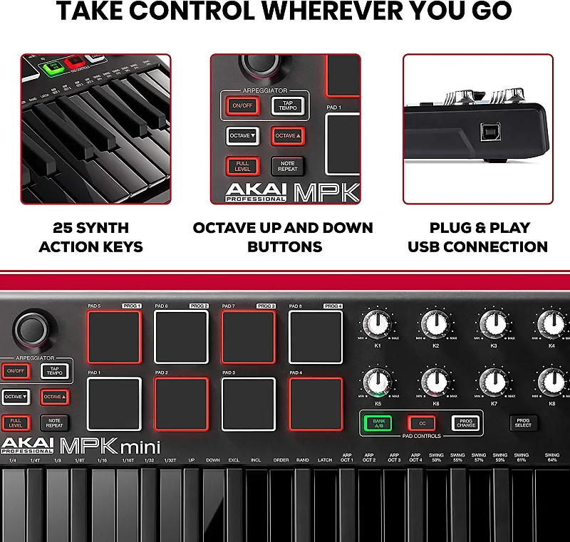 Для максимальной портативности MPK Mini MKII LE Black не требует установки программных драйверов или внешнего адаптера питания.Сочетание подключения plug-and-play, бесшовного USB-MIDI соединения и питания через одно USB-подключение к вашему Mac или PC, MPK Mini MKII LE Black является портативной производственной станцией.