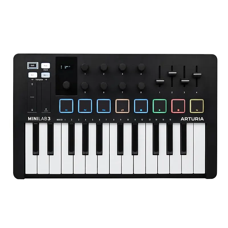 Вы будете играть на MiniLab 3, используя его 25-клавишную клавиатуру с чувствительностью к скорости нажатия и восемь подсвечиваемых пьезоперфоманс-пэдов с поддержкой velocity и aftertouch.