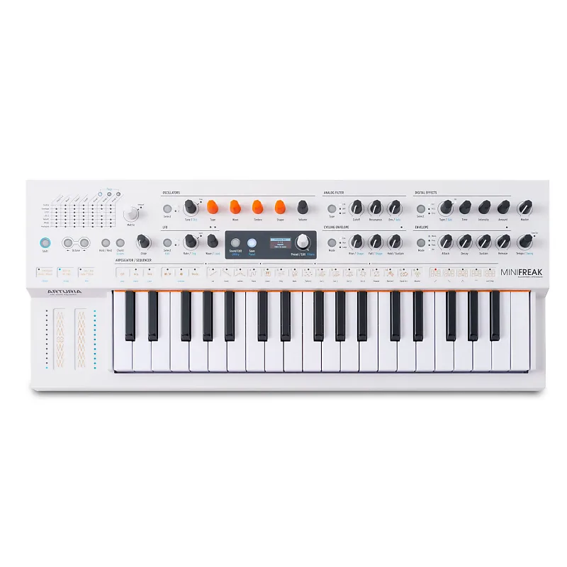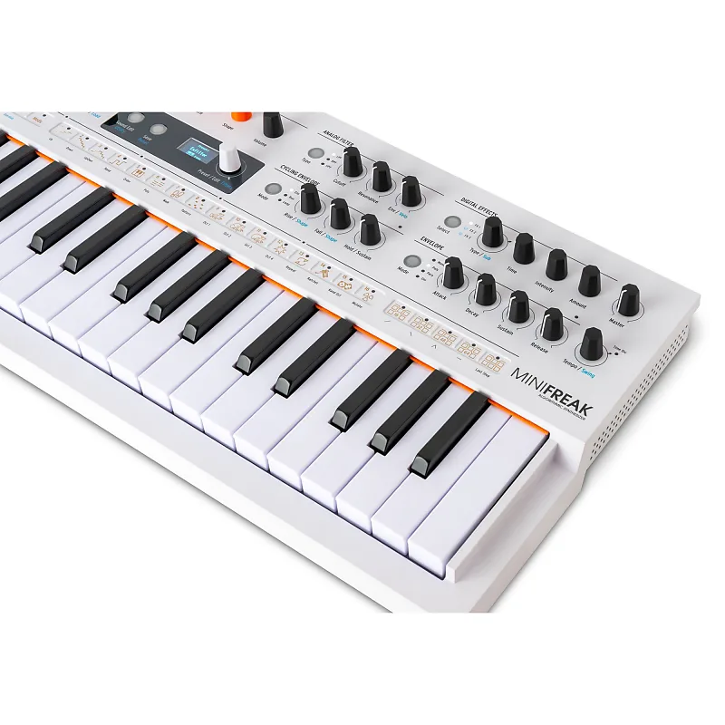 Освободите свой голос, искажайте реальность и ныряйте в хаос - MiniFreak возвращается в смелом бело-оранжевом корпусе с вокодером, который сгибает звук по вашей воле.