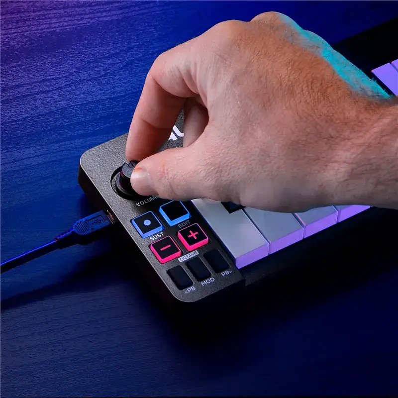 Клавиатура оснащена 32 небольшими клавишами и питается напрямую через USB.Она не требует установки драйверов, так как является class-compliant, и включает в себя богатый комплект бесплатного программного обеспечения .С левой стороны расположены различные элементы управления для раскрытия вашей экспрессивности: кнопки для управления pitch bend и modulation, кнопки для транспонирования на октавы, а также настраиваемый поворотный регулятор assignable для передачи сообщений MIDI Control Change, который по умолчанию настроен на управление параметром громкости.