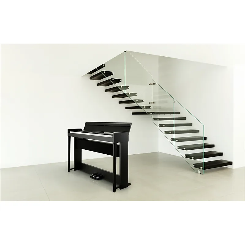 Философия дизайна, примененная при создании C1 Air-BK, отдает дань уважения традиционному акустическому пианино, при этом стремясь выделиться среди других подобных продуктов.Его современный дизайн включает в себя некоторые характерные элементы, такие как две слегка изогнутые ножки, которые элегантно подчеркивают профиль, а тонкая линия с глубиной всего 26 см делает его легко устанавливаемым в любом помещении.Клавиатура защищена специальной крышкой с мягким закрытием, которая одновременно служит подставкой для нот, когда она открыта.