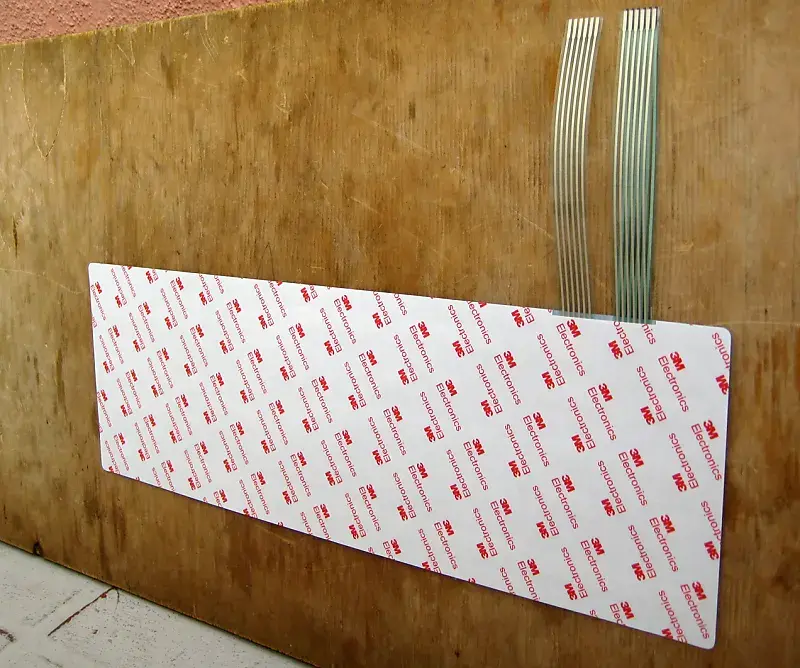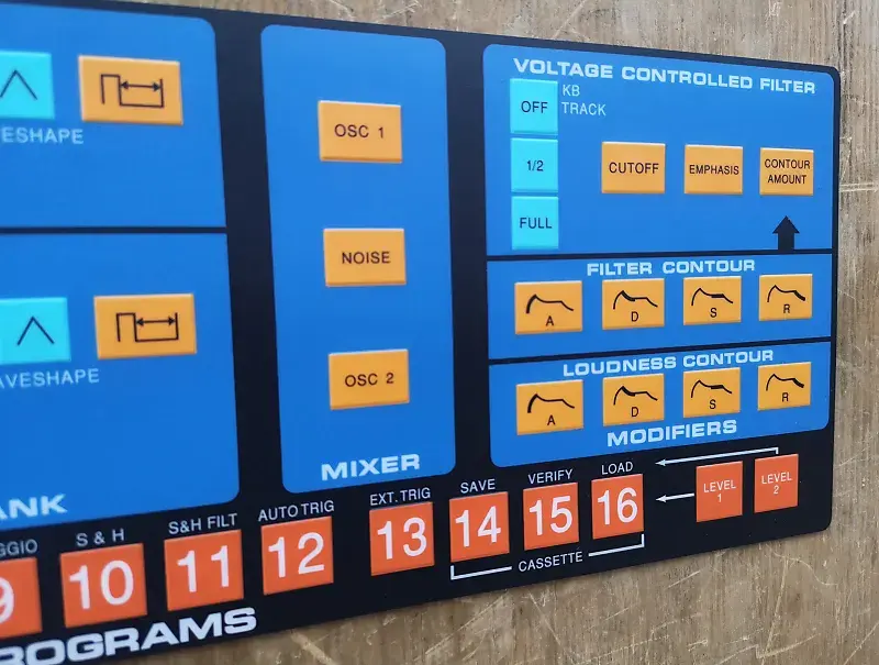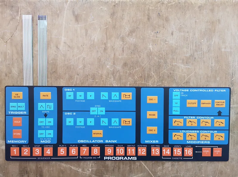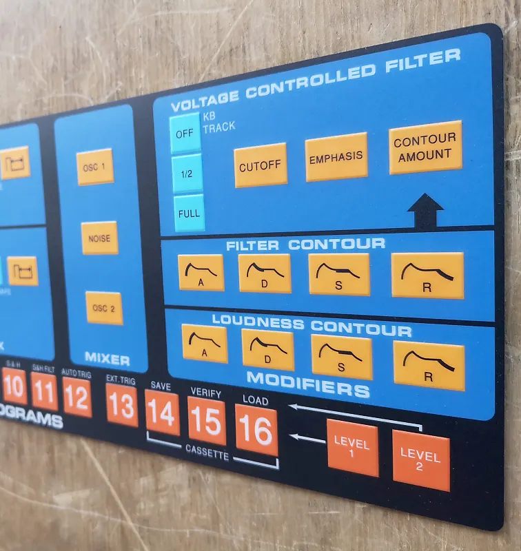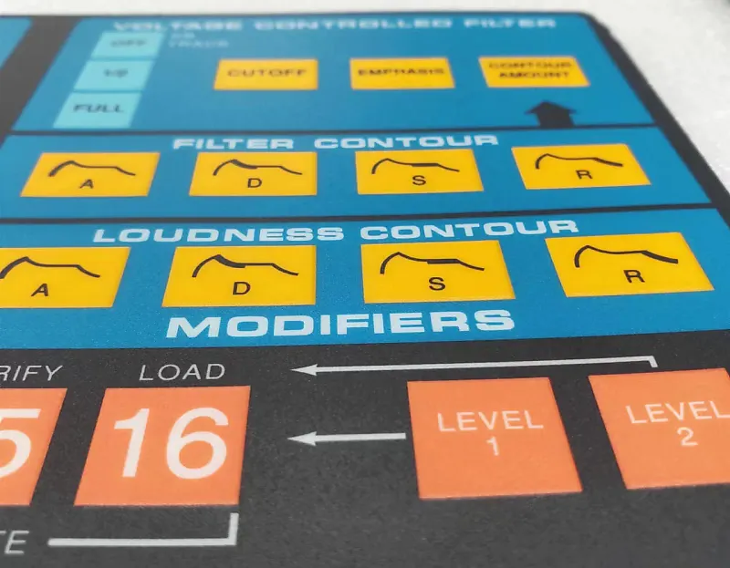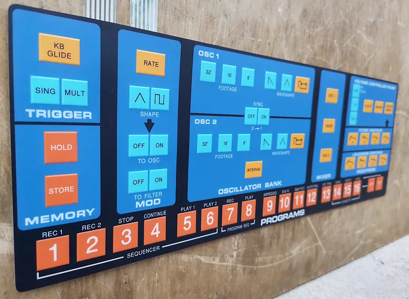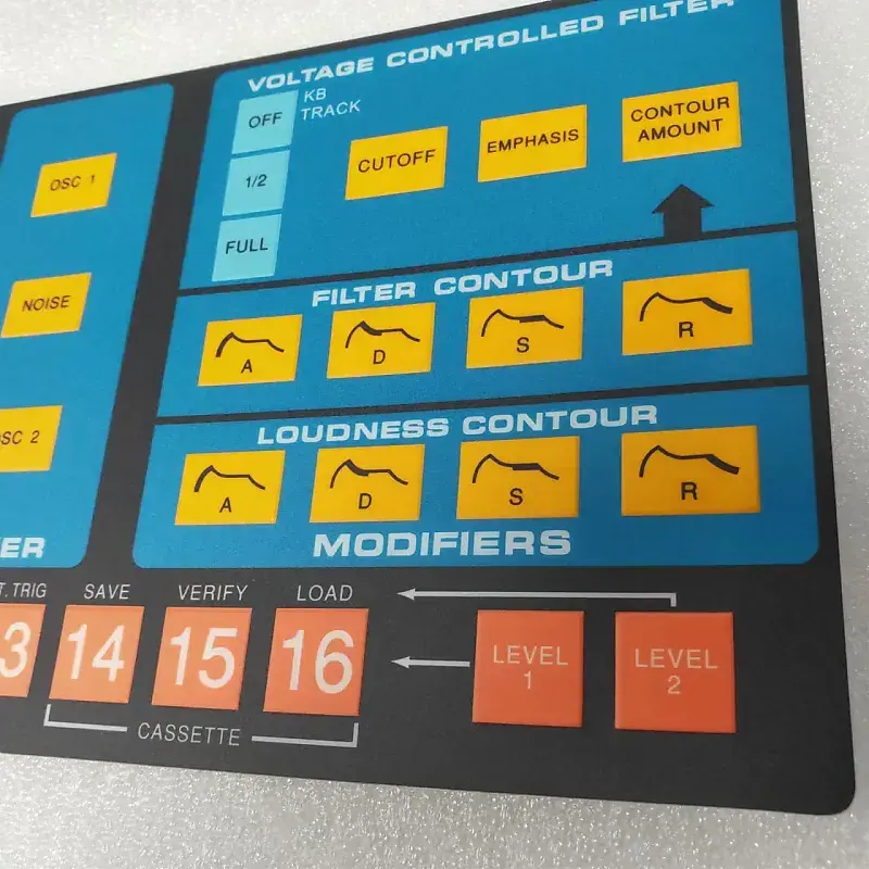 Первый слой снизу - это восковая бумага, приклеиваемая к промышленному клею 3M с эффектом «отклей-и-приклей», которая удаляется во время установки.Второй слой сверху - сам промышленный клей 3M.Следующие слои - гибкие подложки печатной платы, обеспечивающие цепь/крепление для переключателей и три внешние контактные вкладки.Над ними установлены переключатели с защелкивающейся мембраной.Верхний слой - тот же высококачественный формованный поликарбонат, что и все накладки Synhouse, с шестицветной шелкографической печатью оригинального дизайна Moog Source, нанесенной снизу, чтобы она никогда не стиралась с верхней поверхности; при этом каждый слой, скрепленный промышленным клеем.