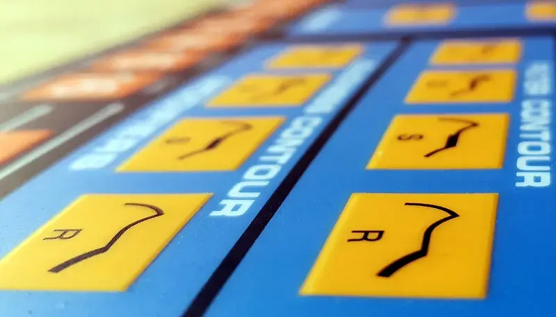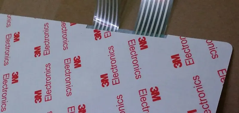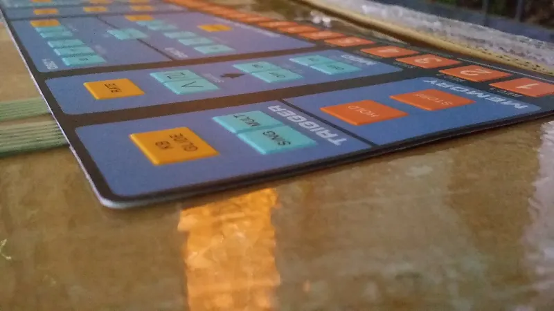Другое фото показывает экстремальное крупное увеличение края панели кнопок, чтобы можно было увидеть конструкцию гибридного механического переключателя/электронной гибкой печатной платы/шестицветного шелкографического поликарбонатного покрытия в виде сэндвича.
