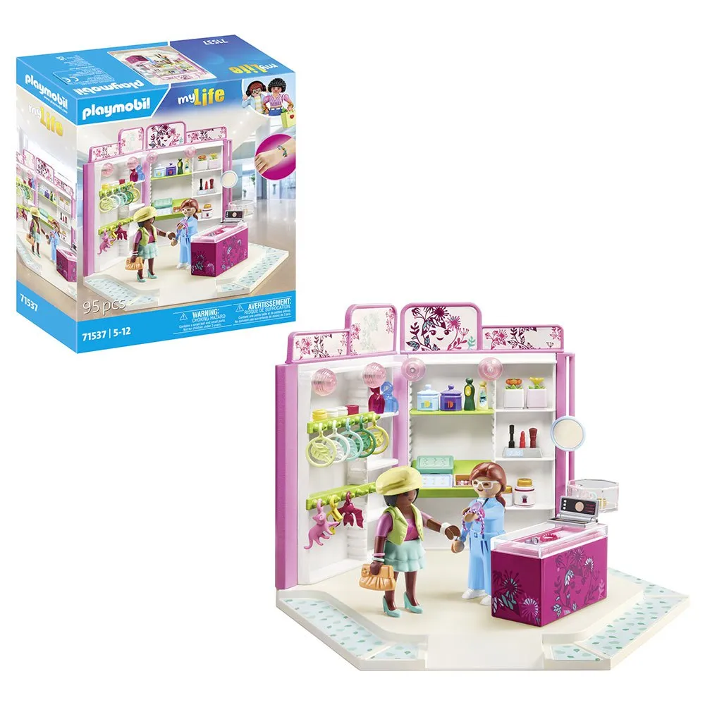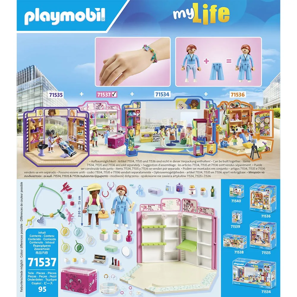 - С любовью оформленный магазин косметики с двумя фигурками PLAYMOBIL, витриной, коробочками, браслетами, цветочными звездочками, губной помадой и многими другими аксессуарами для макияжа и ювелирных украшений.