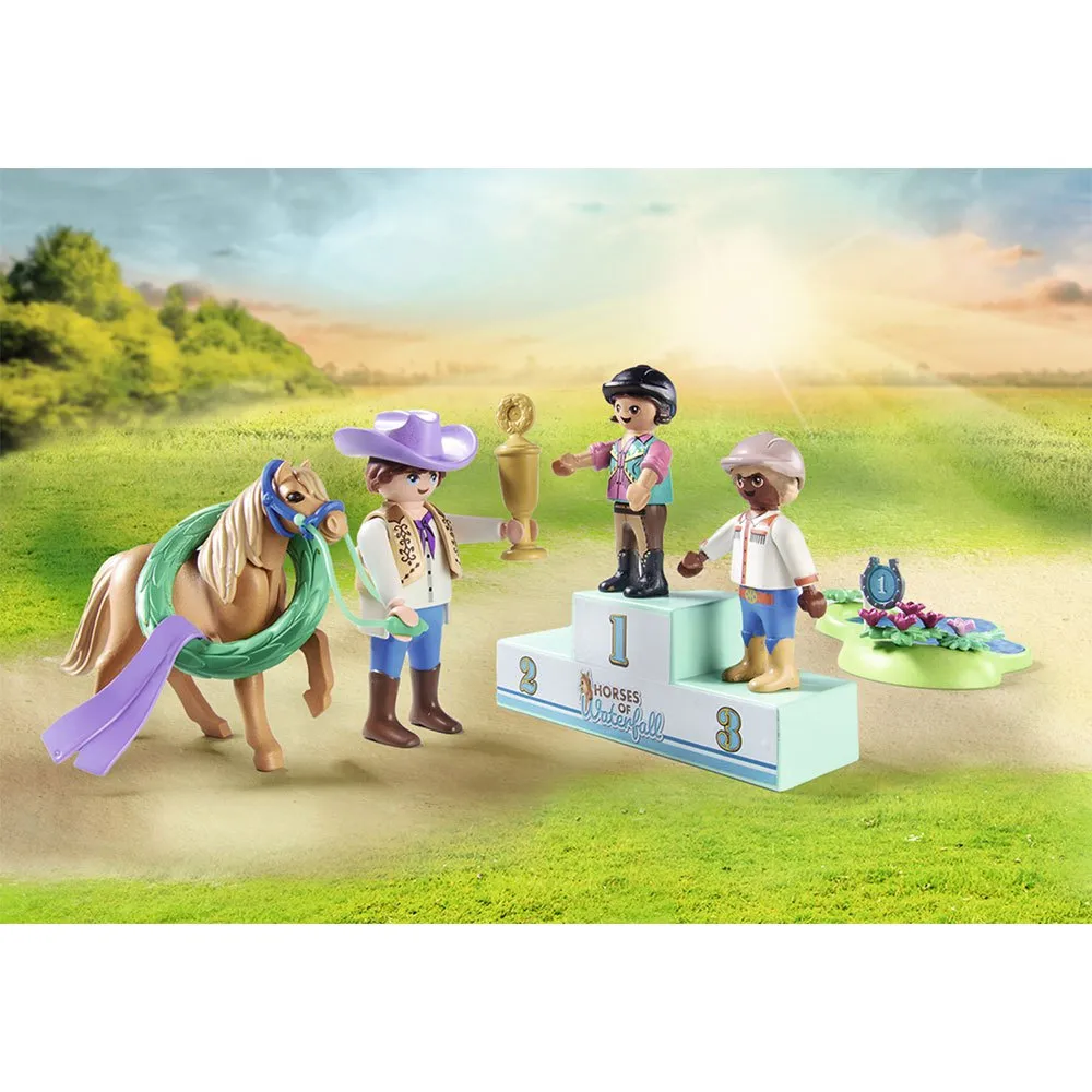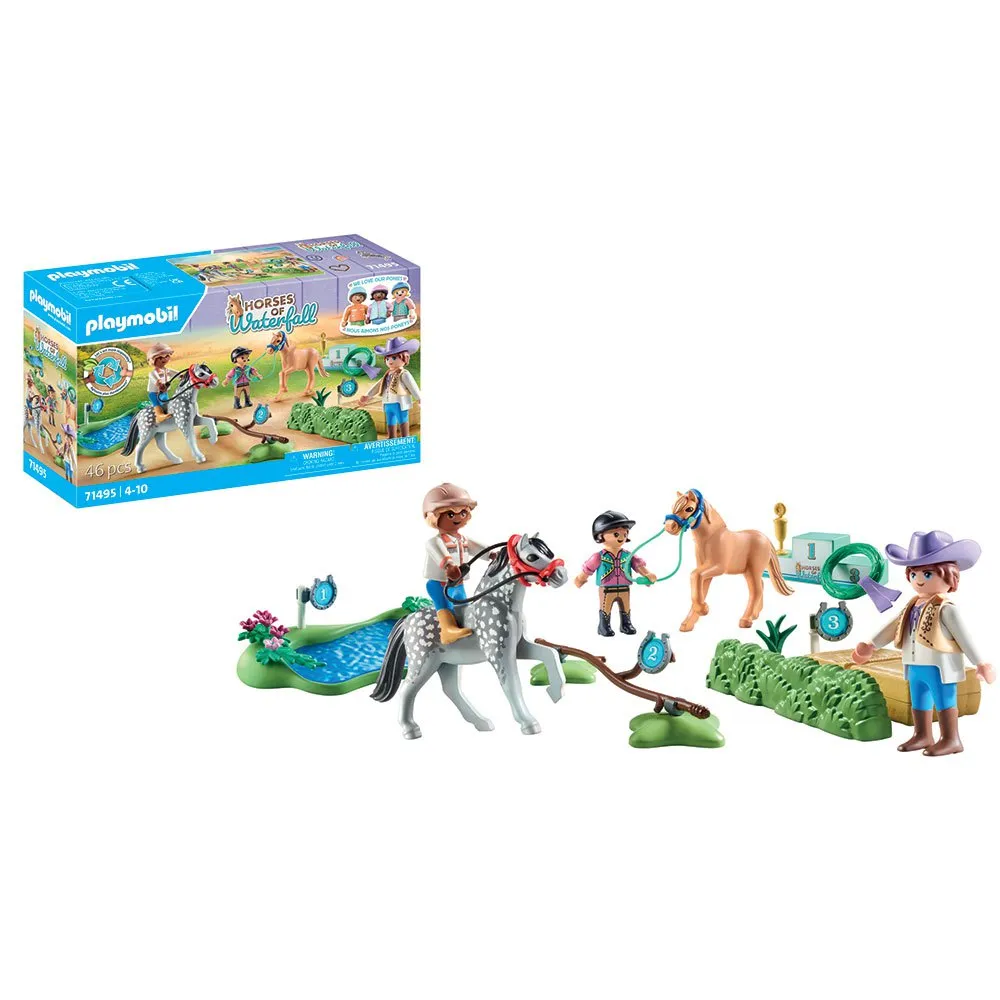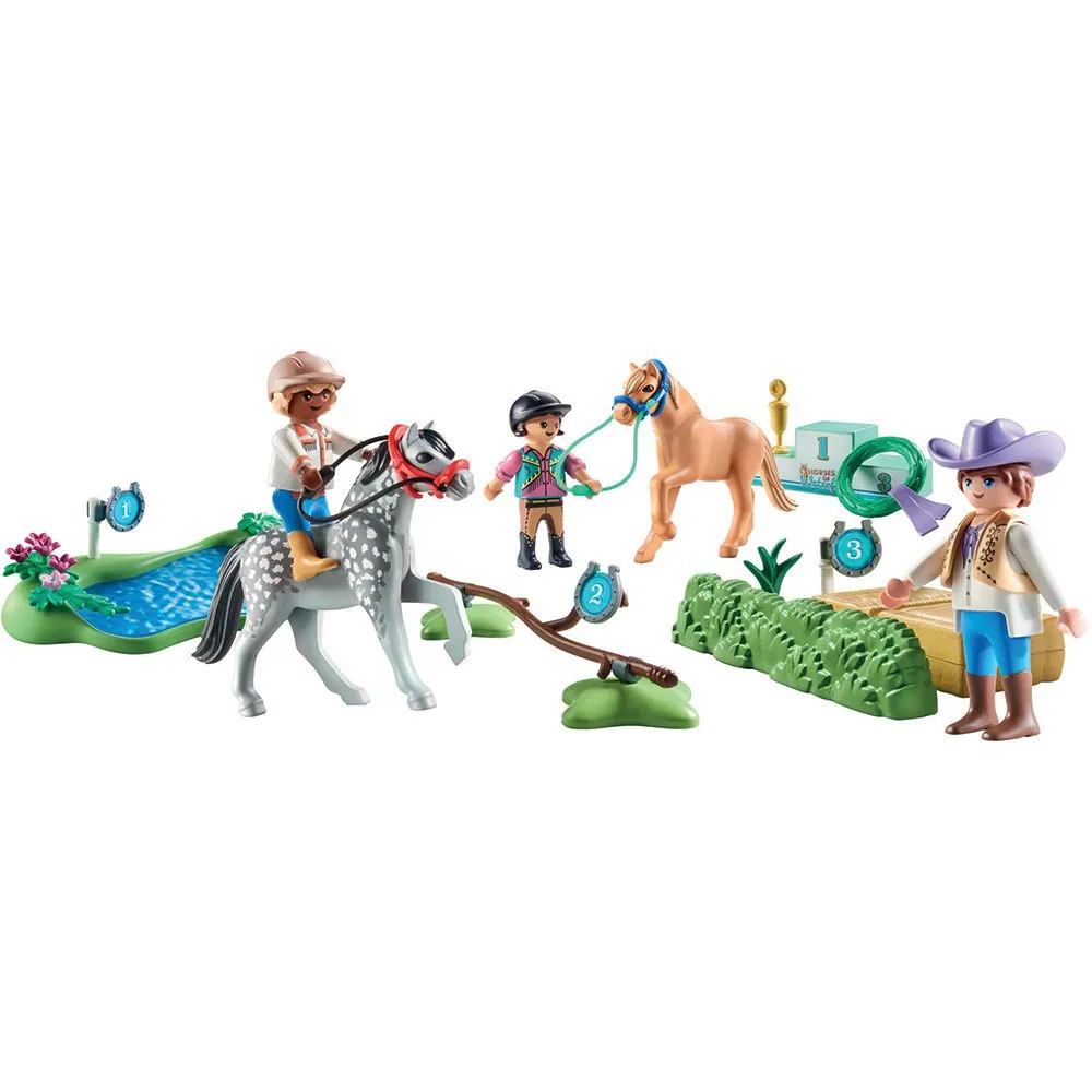 - Игрушка PLAYMOBIL с тремя фигурками PLAYMOBIL, двумя пони, тремя ограждениями, подиумом, победной короной, шлемами и многими другими аксессуарами для захватывающих соревнований по верховой езде в игровой комнате.