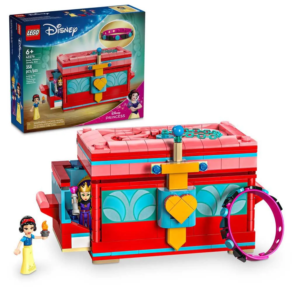 - Шкатулка для драгоценностей: включает в себя сборную игрушку-шкатулку для драгоценностей с запирающейся крышкой, браслет, множество декоративных элементов и фигурки мини-кукол Белоснежки и злой королевы LEGOB ЗЂ Disney