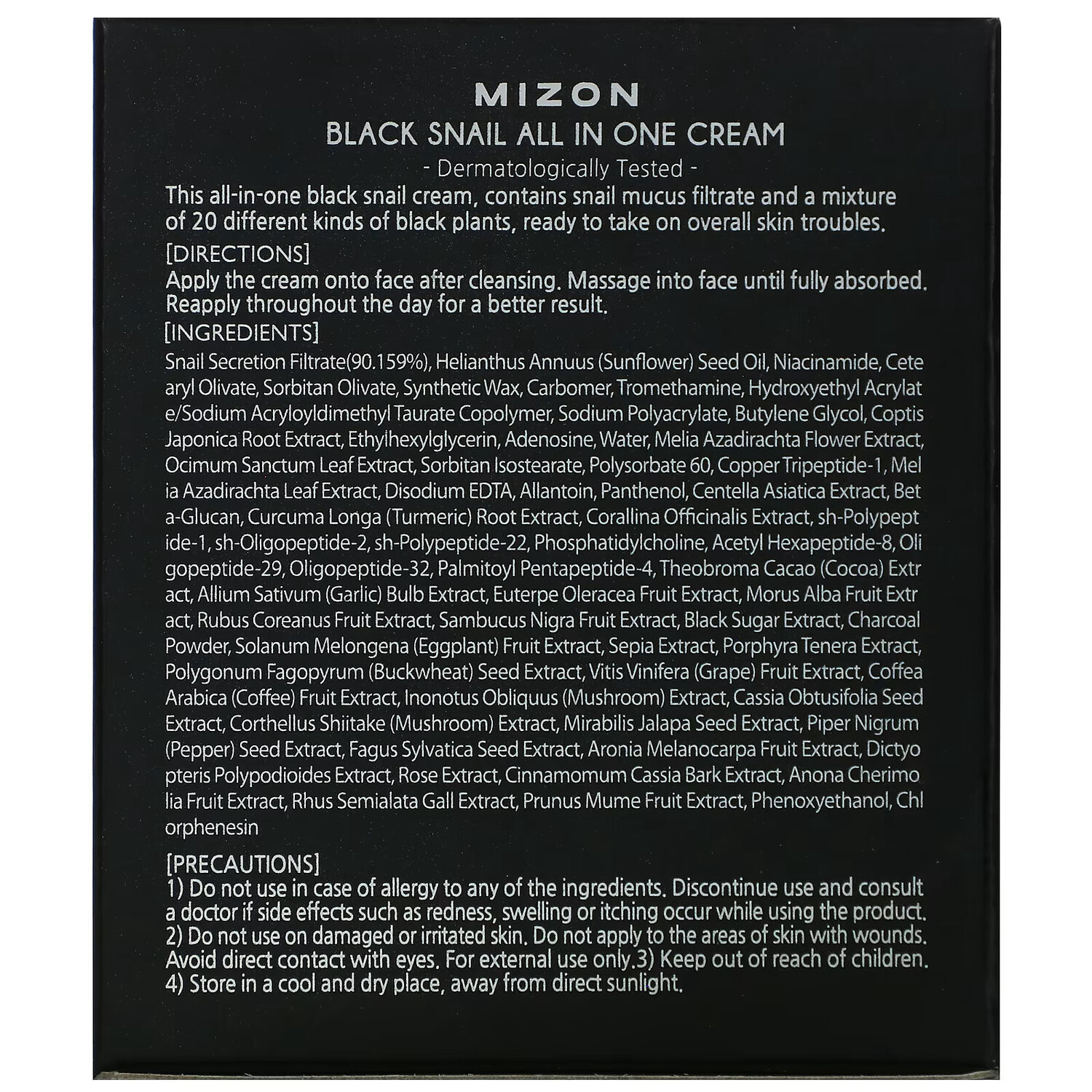 фильтрат секрета улитки (90,159%), подсолнечное масло (Helianthus annuus), никотинамид, цетеарил оливат, сорбитан оливат, синтетический воск, карбомер, трометамин, гидроксиэтил акрилат/натрия акрилоилдиметилтаурата сополимер, полиакрилат натрия, бутиленгликоль, экстракт корня коптиса японского (Coptis japonica), этилгексилглицерин, аденозин, вода, экстракт цветов дерева ним (Melia azadirachta), экстракт листьев базилика священного (Ocimum sanctum), сорбитана изостеарат, полисорбат 60, трипептид меди-1, экстракт листьев дерева ним (Melia azadirachta), двунатриевая ЭДТК, аллантоин, пантенол, экстракт готу колы (Centella asiatica), бета-глюкан, экстракт корня куркумы (Curcuma longa), экстракт красной водоросли кораллины лекарственной (Corallina officinalis), sh-полипептид-1, sh-олигопептид-2, sh-полипептид-22, фосфатидилхолин, ацетил гексапептид-8, олигопептид-29, олигопептид-32, пальмитоил пентапептид-4, экстракт какао (Theobroma cacao), экстракт луковиц чеснока (Allium sativum), экстракт ягод асаи (Euterpe oleracea), экстракт ягод белой шелковицы (Morus alba), экстракт ягод корейской ежевики (Rubus coreanus), экстракт ягод бузины (Sambucus nigra), Черный сахар и мед, порошок из древесного угля, экстракт плодов баклажана (Solanum melongena), экстракт стевии, экстракт водорослей нори (Porphyra tenera), экстракт семян гречихи (Polygonum fagopyrum), экстракт винограда (Vitis vinifera), экстракт зерен кофе (Coffea arabica), экстракт гриба чаги (Inonotus obliquus), экстракт семян кассии туполистной (Cassia obtusifolia), экстракт гриба шиитаке (Corthellus shiitake), экстракт семян ночной красавиці (Mirabilis jalapa), экстракт зерен черного перца (Piper nigrum), экстракт семян бука (Fagus sylvatica), экстракт ягод черноплодной рябины (Aronia melanocarpa), экстракт водорослей Dictyopteris polypodioides, экстракт розы, экстракт коры кассии (Cinnamomum cassia), экстракт плодов черимойи (Anona cherimolia), экстракт галлов сумаха китайского (Rhus semialata), экстракт абрикоса (Prunus mume), феноксиэтанол, хлорфенезин.