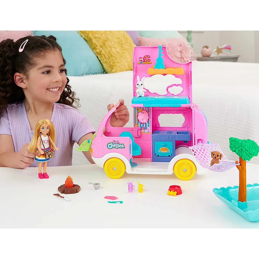 Дайте волю своему воображению с куклой Челси и двумя ее питомцами в игровом наборе BarbieB Chelsea 2 в 1 Campervan.