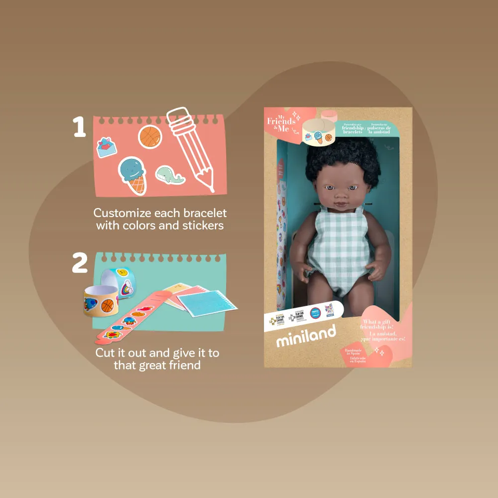 Как приятно делиться этим с нашими друзьями! Африканская кукла My Friends & Me длиной 38 см является неотъемлемой частью новой коллекции кукол и статуэток Miniland, созданной для пропаганды ценности дружбы и волшебства совместного использования с раннего возраста.