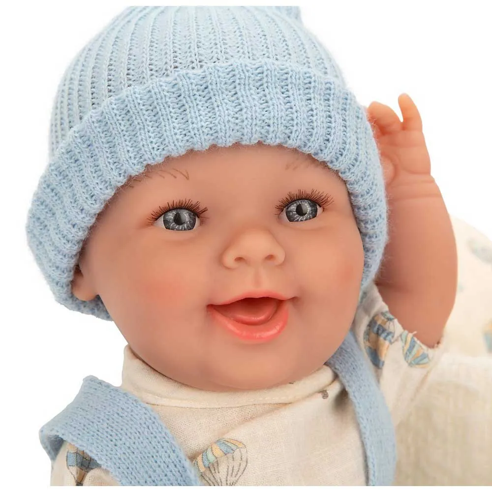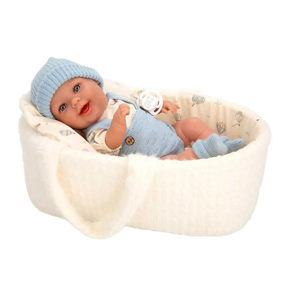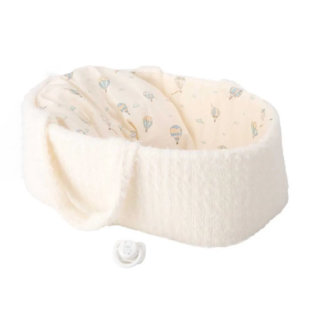 Этот малыш одет в красивый шерстяной наряд синего и бежевого цветов, который подходит к его шерстяной люльке.