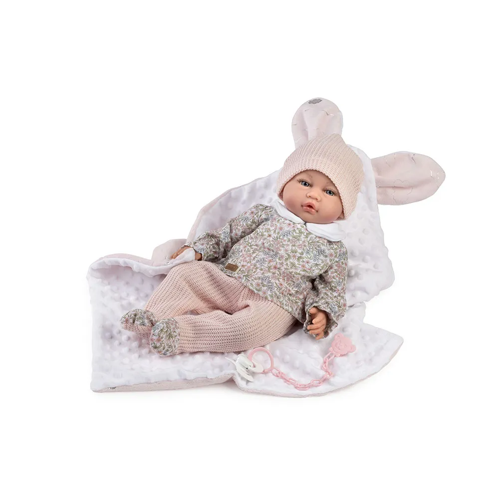 Утяжеленная кукла Бруна одета в розовые шерстяные леггинсы и шапочку.