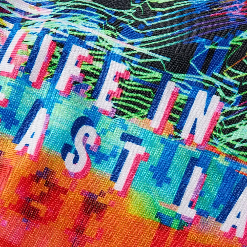 Пройдите тренировку быстро в нашем простом купальнике с V-образным вырезом, украшенном привлекательным цифровым принтом и слоганом Жизнь на быстрой полосе.