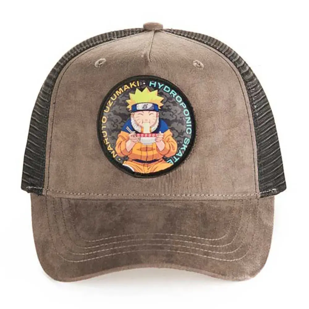 Кепка snapback из сетчатого материала с 5 панелями от официального производителя Naruto X Hydroponic, с глубоким вырезом, изогнутым козырьком и специальной застежкой. NarutoB Тканый лоскут с изображением Нарутоба, поедающего свое любимое блюдоВ Рамен.