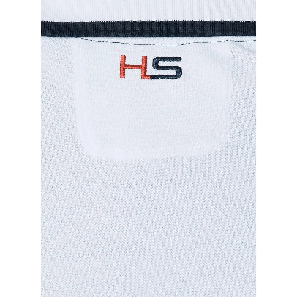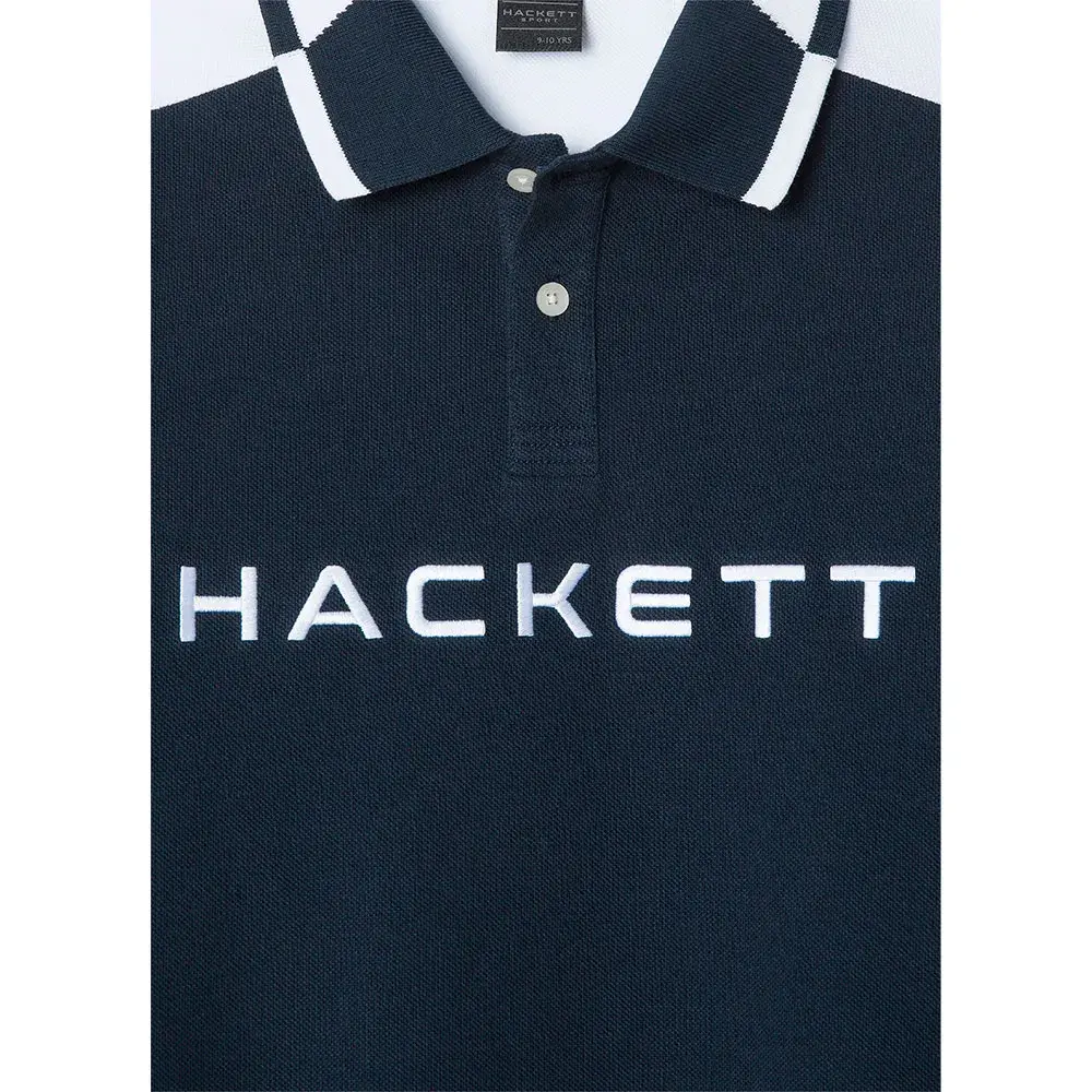 Интересная многоцветная окантовка на воротнике из плоского трикотажа, манжеты из плоского трикотажа в рубчик и крупная плоская резиновая нашивка Hackett на груди.