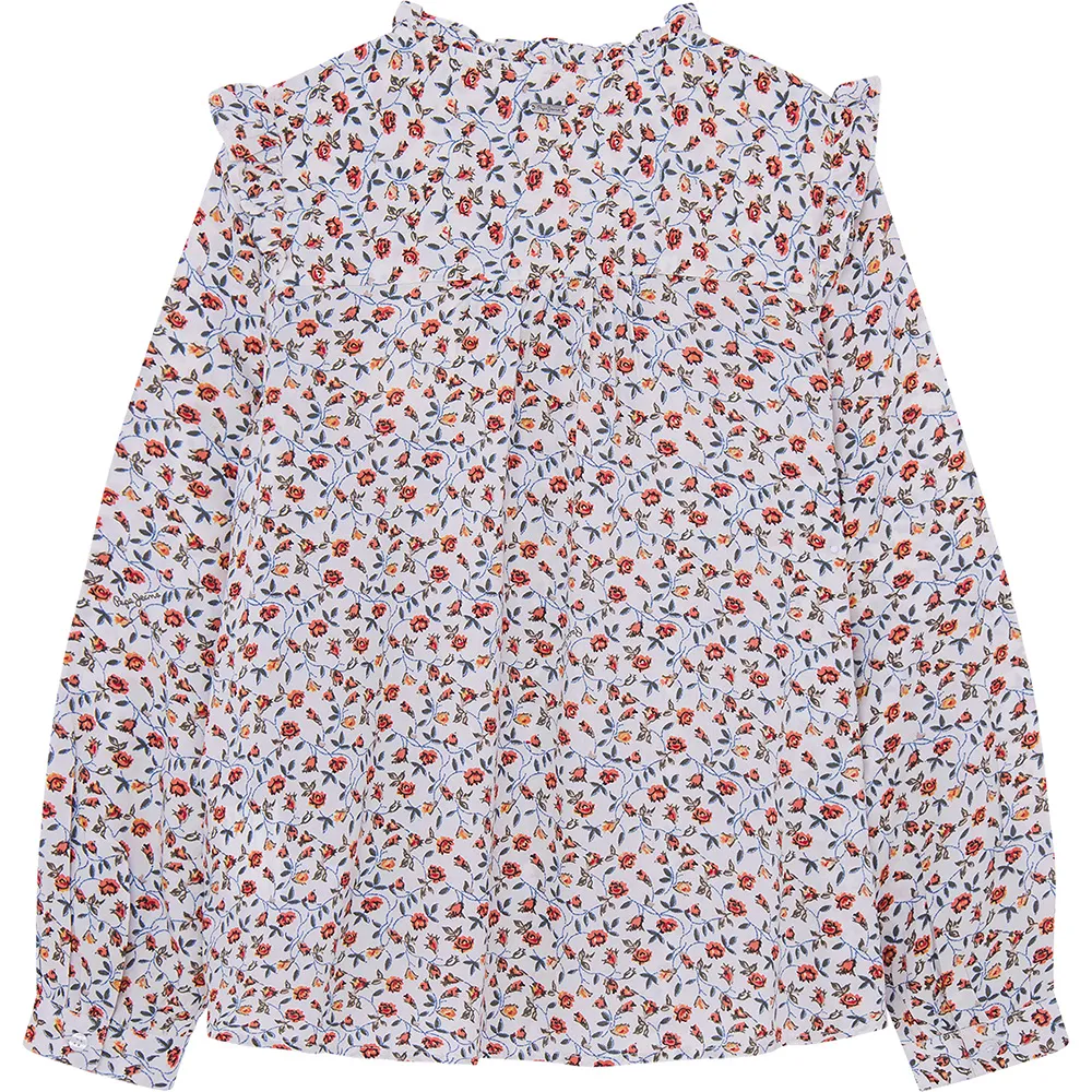 Мягкая блузка в цветочек с круглым вырезом и длинными рукавами.