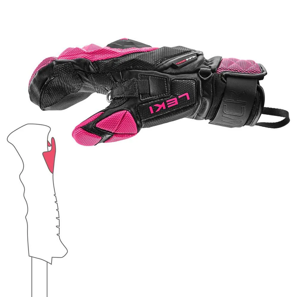 Представляем вам лучшие гоночные варежки для Кубка мира. Эти новые варежки были протестированы и разработаны в тесном сотрудничестве со спортсменами LEKI, участвующими в соревнованиях Кубка мира. Усиленная подкладка защищает руку при контакте с воротами слалома и снегом. Полностью интегрированная гибкая панель из термопластичного полиуретана защищает тыльную сторону ладони и обеспечивает оптимальную амортизацию. На пальцах добавлены дополнительные силиконовые полигональные накладки. Накладки усилены снаружи керамической оболочкой, что обеспечивает особую прочность и устойчивость к истиранию. Сочетание скоростной панели, силиконовых накладок и защиты большого пальца образует Glidezone. Это обеспечивает наилучшую защиту рук, в то же время позволяя перчатке задевать ворота при случайном касании без потери скорости для спортсмена.