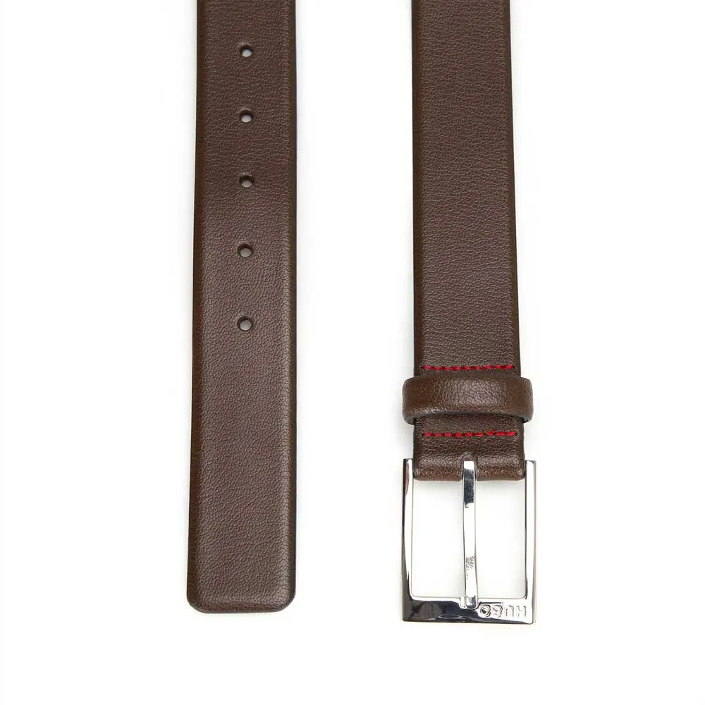 Мужской ремень HUGO с пряжкой в тон с выгравированным логотипом является незаменимым деловым аксессуаром. Изготовлен из зернистой кожи. Ширина 3,5 см. Для лучшей подгонки мы рекомендуем заказывать пояс на размер больше вашего размера талии. Этот продукт содержит сырье как минимум на 60% лучшего качества. Мы постоянно ищем более ответственные способы производства и отделки наших изделий. Минимум 60% кожи, используемой для изготовления этого изделия, было произведено на сертифицированных кожевенных заводах.