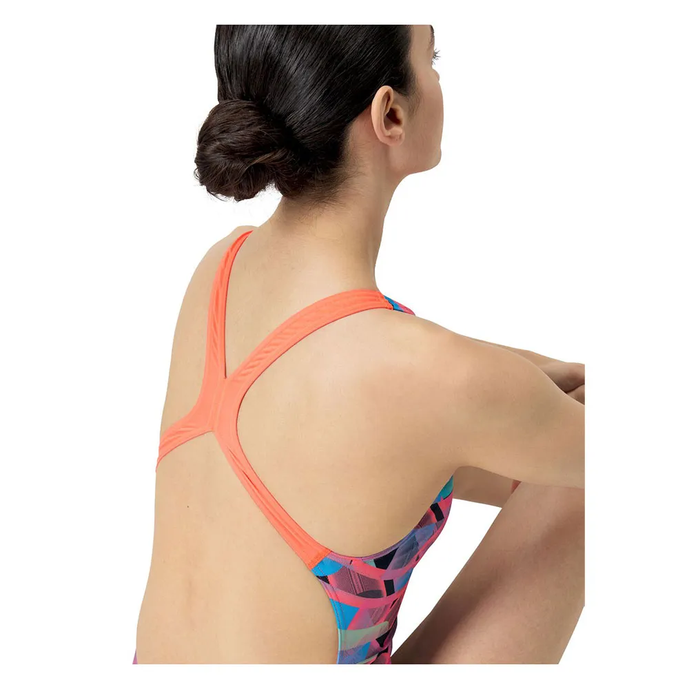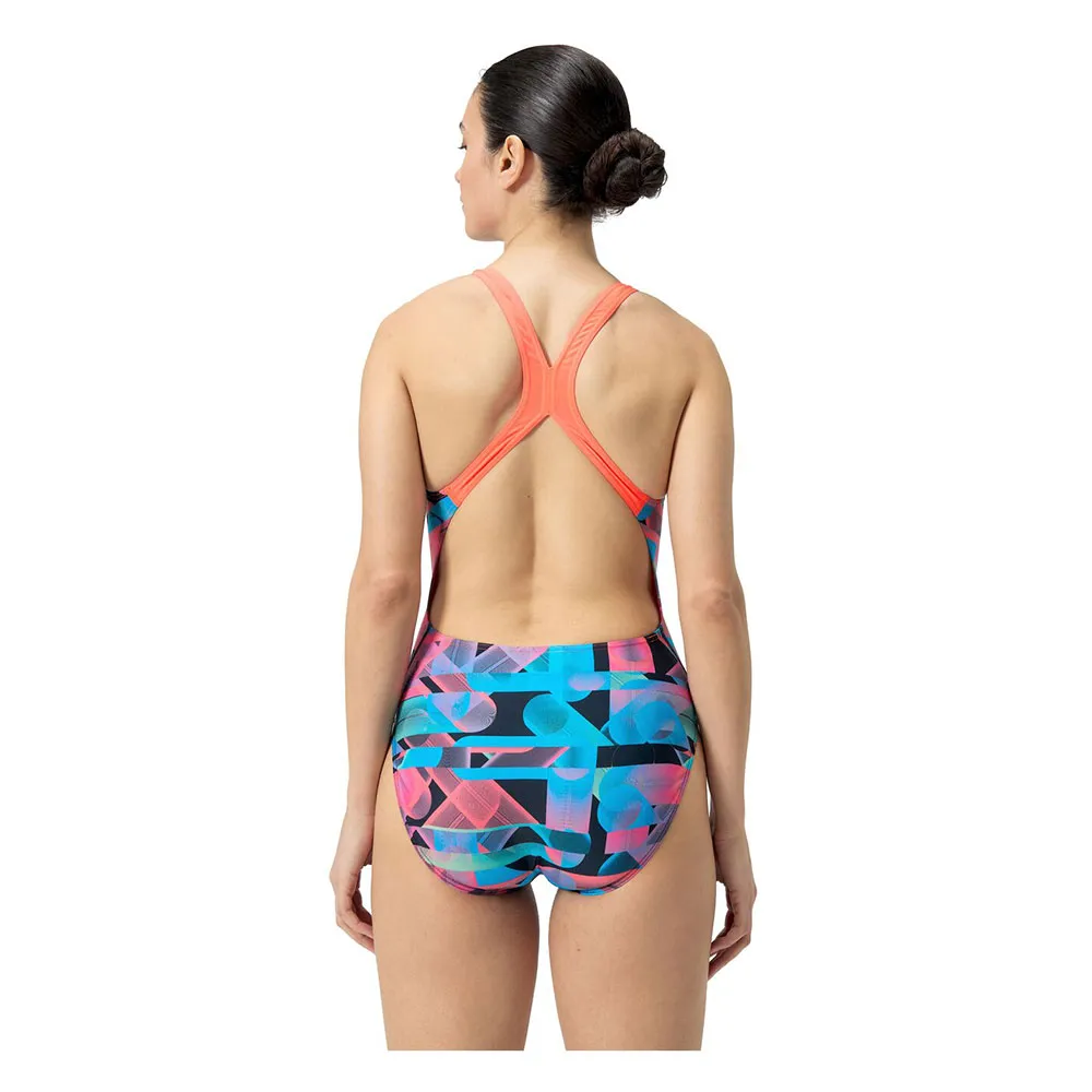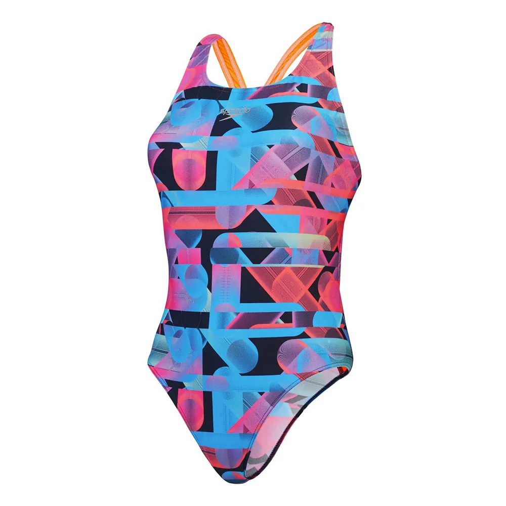 Почувствуйте скорость и мощь во время тренировки в нашем ярком купальнике Powerback с динамичным контрастным геометрическим принтом насыщенных красного и синего цветов.