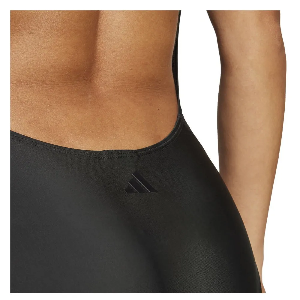 Этот купальник adidas с тремя полосками и V-образным вырезом сзади имеет круглую горловину и средний вырез для свободы движений.